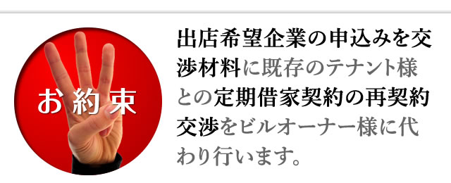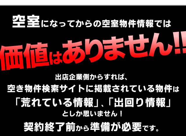 よくテナント様が言われる本音定期借家期間満了数か月前に空き物件情報を知っても年度予算や社内稟議の関係で出店までには少なくとも1年はかかる。できれば1年以上前から空き予定物件がわかっていれば余裕をもって検討できるんだが...