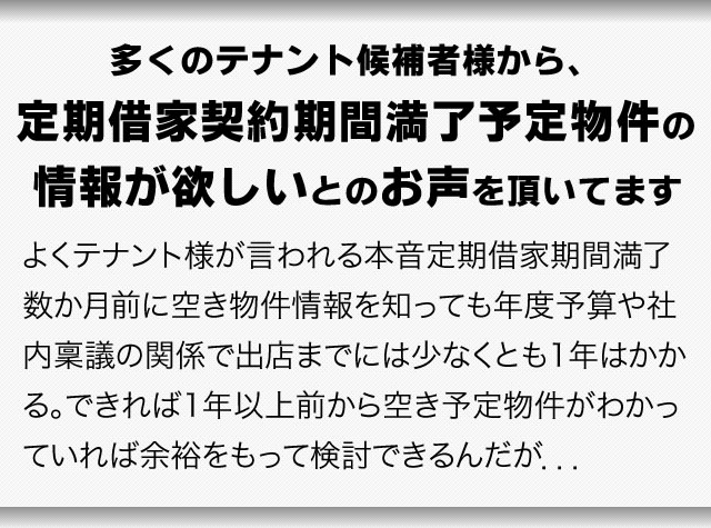 よくテナント様が言われる本音定期借家期間満了数か月前に空き物件情報を知っても年度予算や社内稟議の関係で出店までには少なくとも1年はかかる。できれば1年以上前から空き予定物件がわかっていれば余裕をもって検討できるんだが...